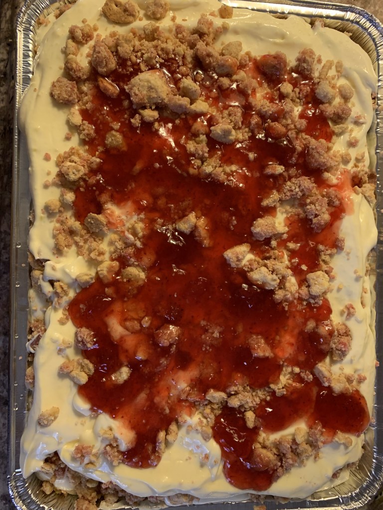 Note: I use Lactose Free milk when preparing the instant vanilla pudding but you can use any milk you’d like. You can use any brand of strawberry preserves or dessert topping you like! Chill overnight or if you want the extra crunch eat immediately! Feel free to add as much cookie mix and pudding to each layer as you like! As you can see in the pictures above, I’ve experimented with different amounts of topping, including how much strawberry preserves to spread on top. It’s all about making it to your taste!