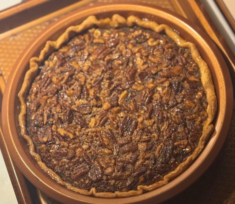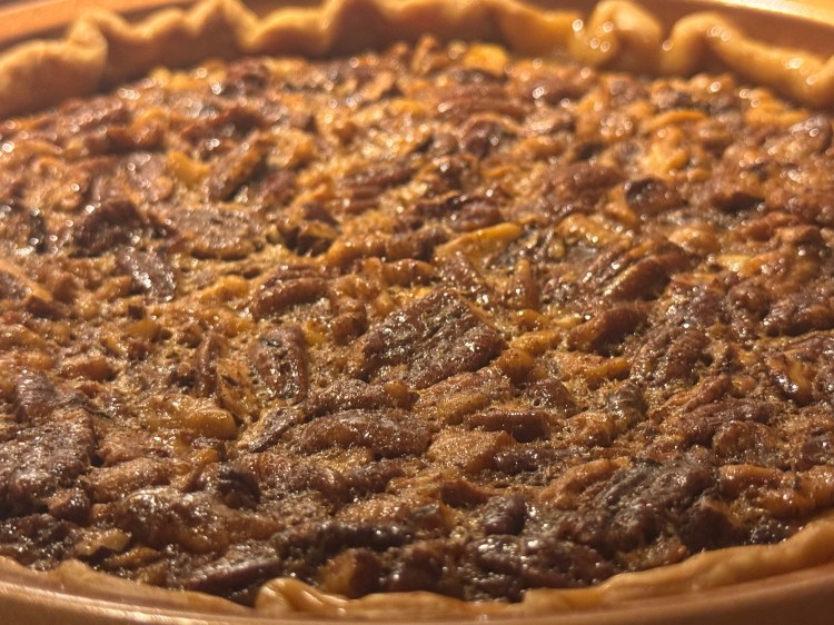 - Pour into your unbaked pie crust, spreading the nuts evenly.