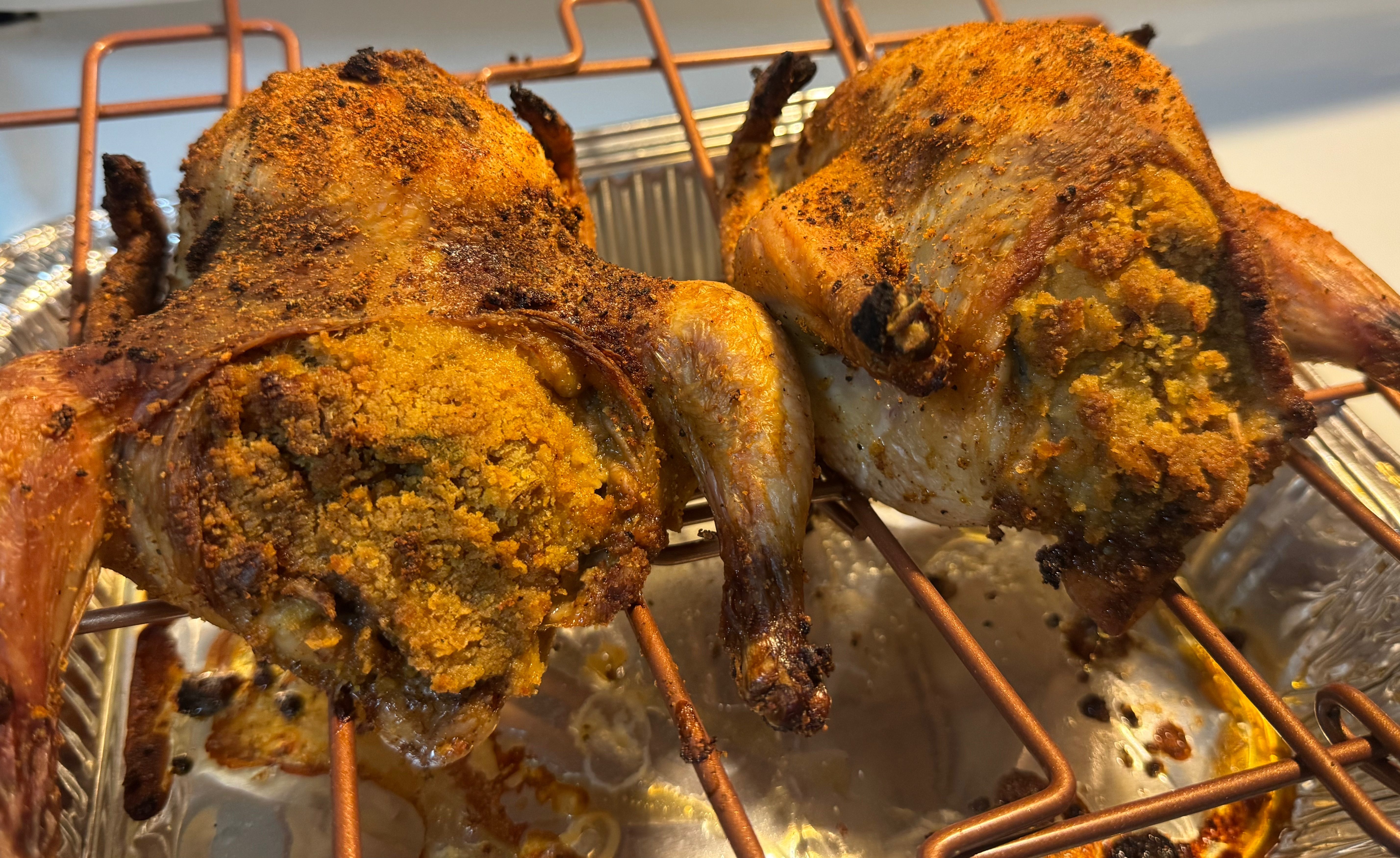 - Arrange for roasting: Place the hens on a roasting pan’s wire rack so that the pan can collect all the drippings. Make sure the hens aren’t touching each other to ensure even cooking and crispy skin.