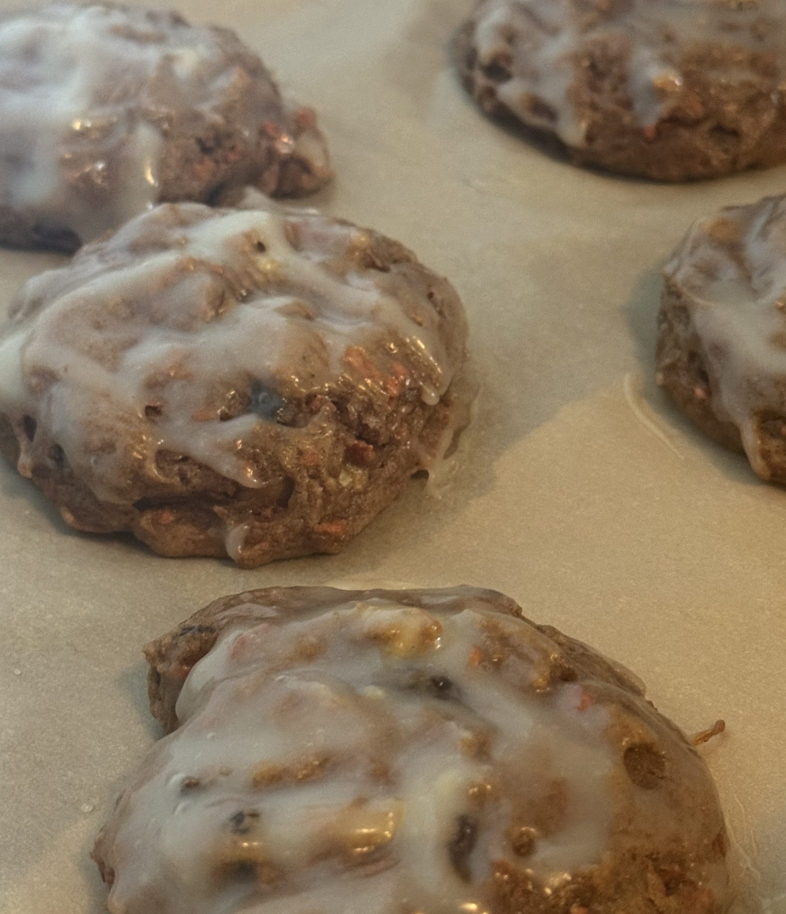 Note: Use whatever add-ins you like in your carrot cake! Make sure your shredded carrots are squeezed dry if they aren’t they’ll add extra moisture to the cookie. Make sure to cool your cookies completely to ensure the cookies don’t become too soft when serving. If your cookies do become too soft you can put them in the oven at 275°F for about 10 minutes to get them to harden up without ruining the glaze and keeping the cookie moist.
