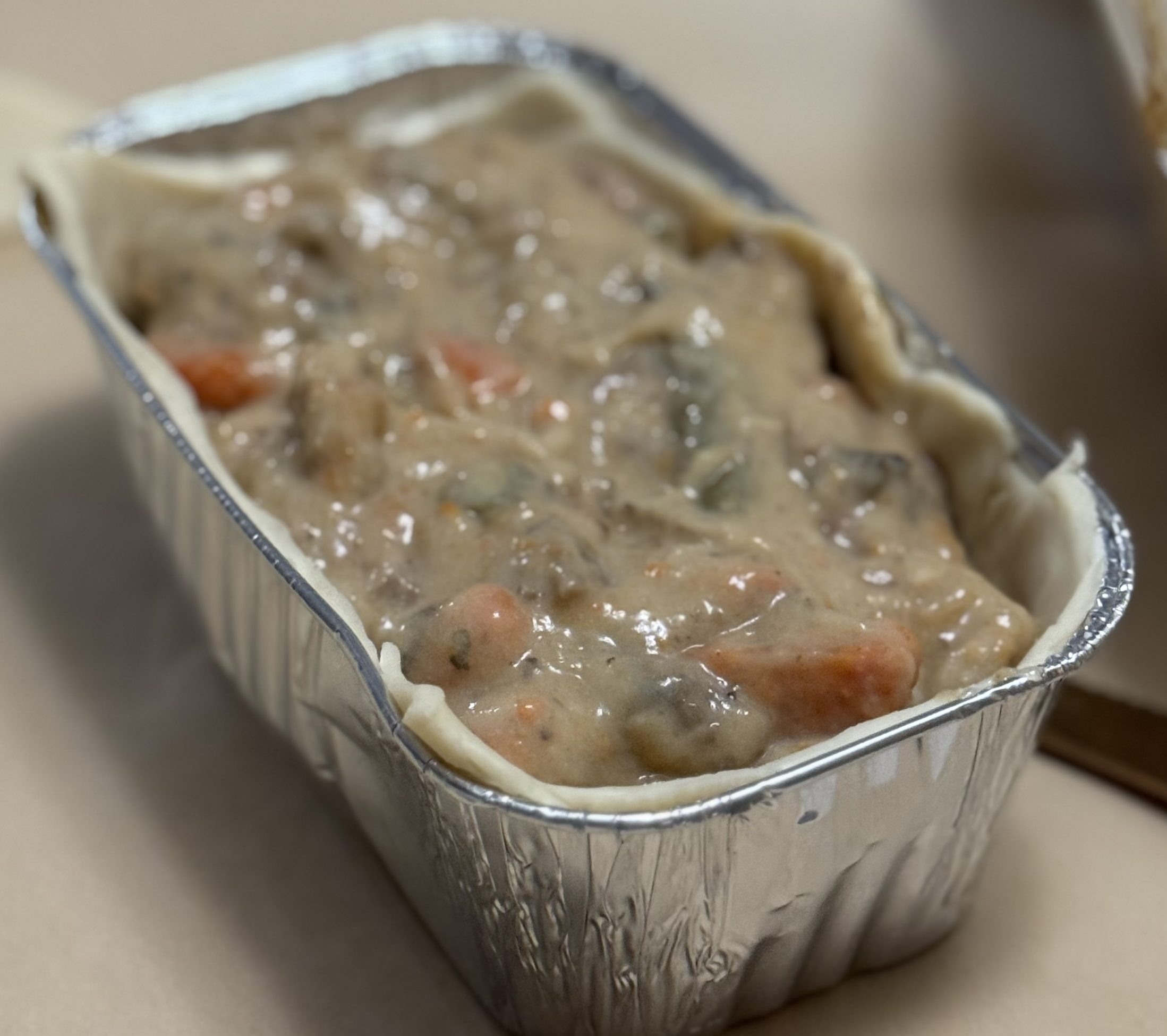 - Press the crust into the pan and fill with cooled beef pot pie filling.